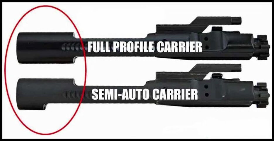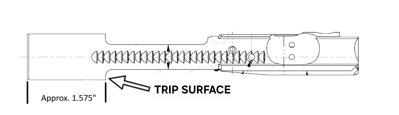 Yes — a full-auto profile BCG (5.56) or full-auto bolt (9mm) is required. Make sure the trip surface opening is essentially square/flat when looking straight down at the bolt, not curved. The trip surface should have a smooth 90° angle all the way down into the bolt’s hammer channel. Inward curved surfaces at the corners of the hammer channel opening leading to the trip surface can snap the lever off.
